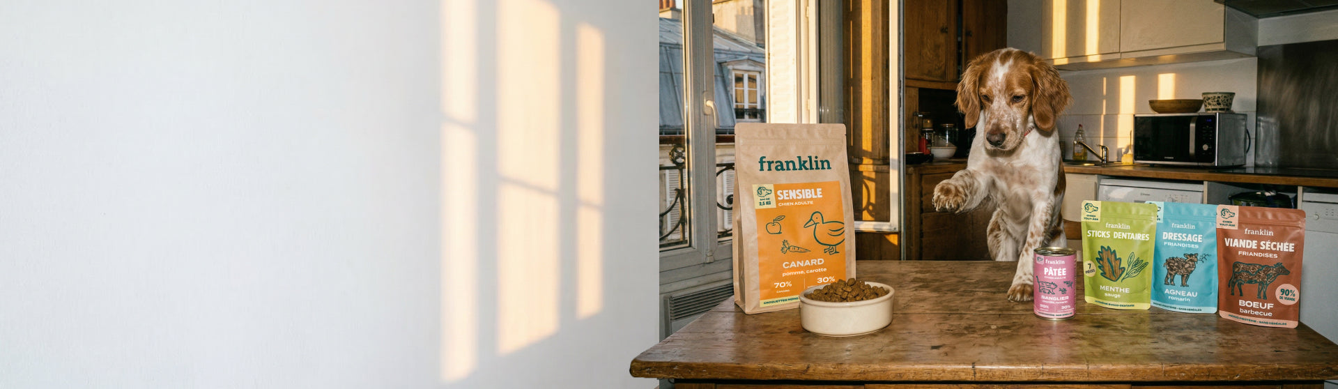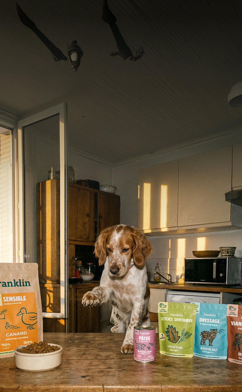 Des combos sélectionnés avec amour par Franklin. Au menu : des recettes mono-protéine pour lutter contre les allergies alimentaires, soutenir la croissance, dégommer les kilos en trop ou améliorer la santé de la peau. Et le tout accompagné de friandises. C'est votre chien qui va être content !
