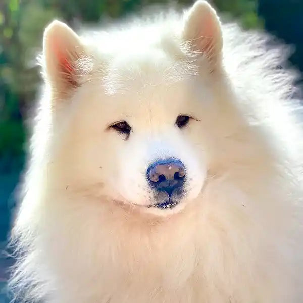 Le Samoyède est un chien au physique impressionnant et harmonieux, adapté à ses origines sibériennes. Avec une taille moyenne allant de 48 à 60 cm au garrot et un poids oscillant entre 20 et 30 kg, il est bien proportionné et musclé. Son museau est robuste et légèrement arrondi, avec une truffe noire qui se distingue sur son pelage éclatant. Ses oreilles, de taille moyenne et en forme de triangle, sont bien dressées et se trouvent positionnées haut sur la tête, leur donnant une expression vive et attentive. Le visage est amical, avec des yeux en forme d'amande qui expriment douceur et intelligence, souvent de couleur brun foncé ou noisette.