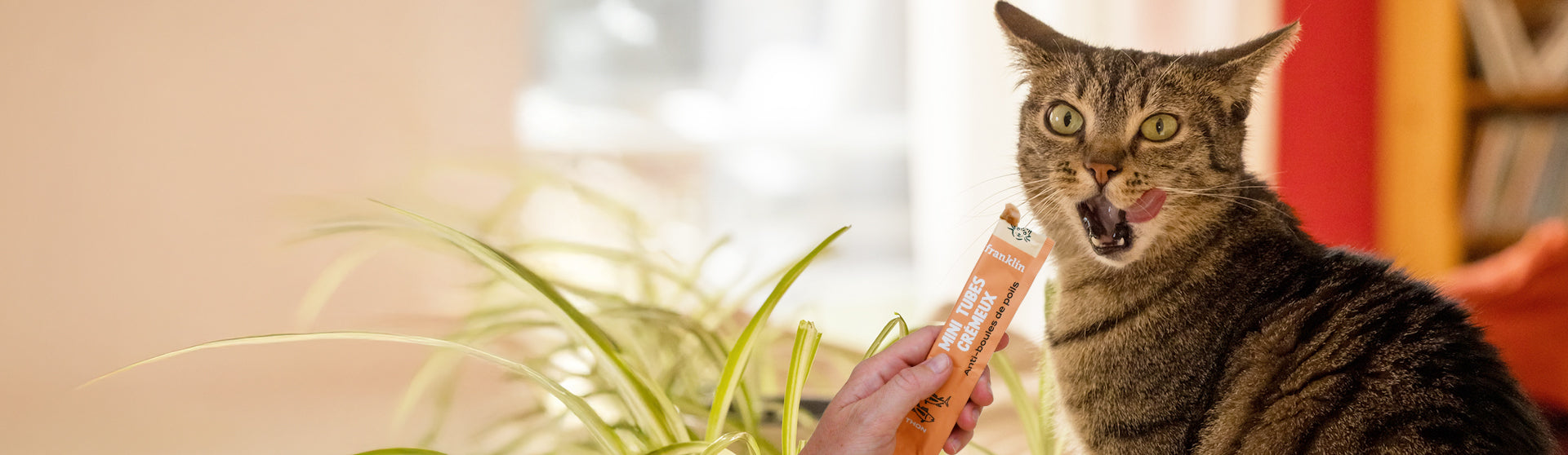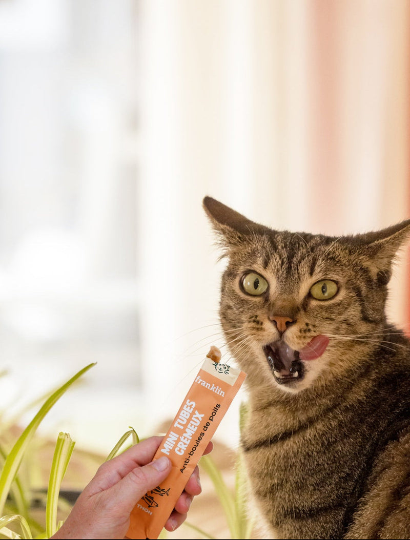 3 saveurs, 3 besoins ciblésPour tous ces félins exigeants qui boudent leur gamelle, Franklin a créé des friandises innovantes, ultra appétentes et peu caloriques : les Mini Tubes Crémeux.