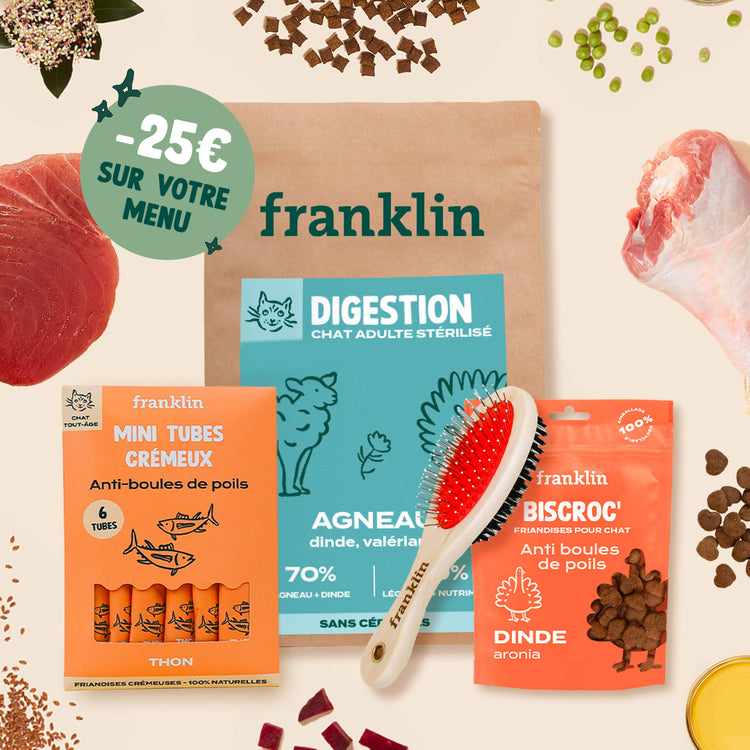 Composition du pack : Croquettes Agneau, Dinde, Valériane (1kg), Friandises Dinde, Aronia (150g), Friandises Mini tubes crémeux Thon (6 tubes), Une brosse Franklin 2-1 pour un pelage étincelant