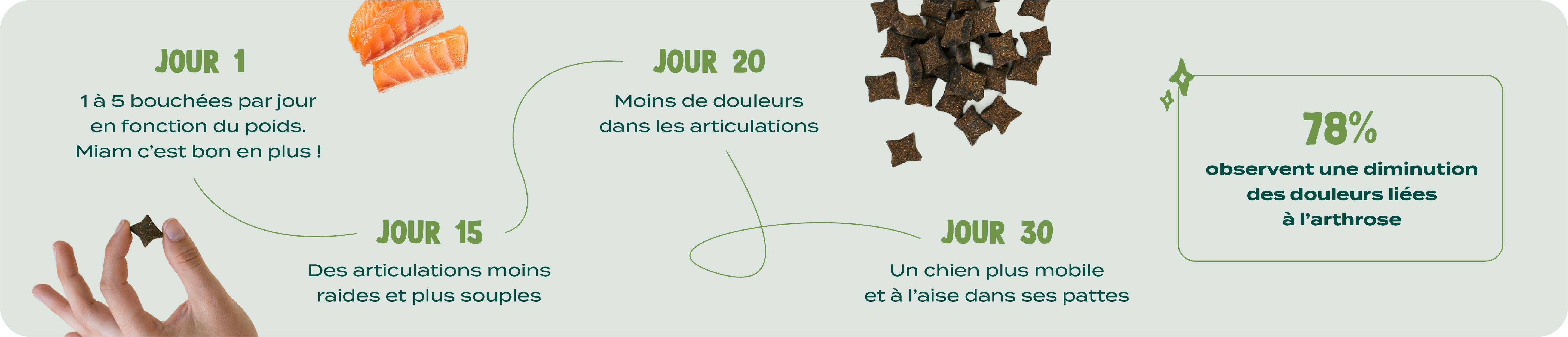 La majorité des clients qui utilisent nos gummies, observent des effets bénéfiques sur leur chien au bout d’un mois environ : meilleure mobilité, souplesse articulaire, moins de douleurs et de raideurs dans les articulations. Bien évidemment, cela ne remplace pas un traitement vétérinaire et doit s’accompagner d’une alimentation équilibrée.