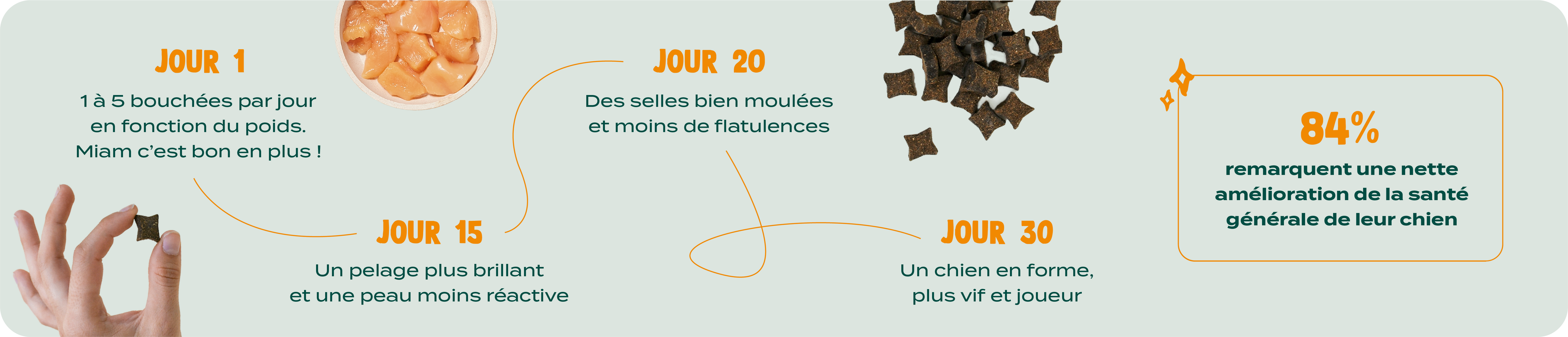 Nos suppléments se présentent sous forme de friandises appétentes. Elles sont beaucoup plus faciles à donner qu’un comprimé ou qu’une gélule. Il suffit de les présenter à votre chien à la manière d’une récompense. Il n’en fera qu’une bouchée ! Vous pouvez aussi l' ajouter directement dans ses croquettes ou dans sa ration ménagère.