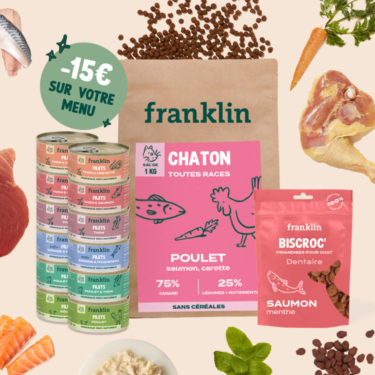 Solidification du squelette, développement musculaire, renforcement des défenses naturelles… Chez le chaton, tout se joue pendant les premiers mois ! Avec notre coffret, offrez-lui une alimentation complète pour bien grandir ! Il réunit des croquettes au poulet et au saumon, riches en protéines et adaptées à la croissance, un assortiment de 6 filets savoureux pour varier les textures, et des friandises au saumon pour prendre soin de ses crocs.