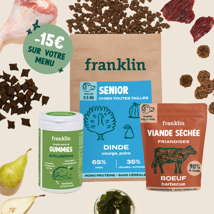 En vieillissant, votre chien a besoin d’une alimentation adaptée pour prendre soin de ses articulations, de sa digestion et de son bien-être général. Avec notre coffret Senior, offrez-lui tout ce dont il a besoin pour bien vieillir ! Notre menu complet associe des croquettes à la dinde, riches en protéines digestes et en vitamines pour soutenir les articulations, des friandises en peau de cabillaud, source naturelle de collagène, et des gummies articulations formulés avec du MSM, de la glucosamine et de la chondroïtine pour renforcer la souplesse articulaire.
