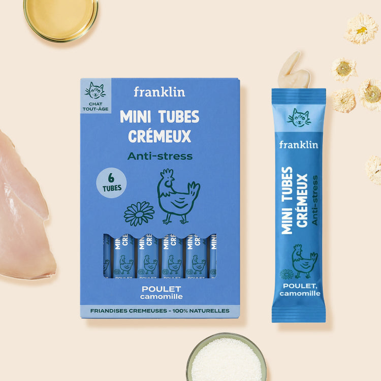 Les mini tubes crémeux anti-stress sont pensés pour aider les chats à se détendre ! Ils contiennent du L-tryptophane, un acide aminé qui favorise la production de sérotonine, l’hormone du bien-être. On y trouve aussi de la camomille, connue pour ses propriétés calmantes. Un duo qui aide à réduire le stress, les tensions et les petits coups d’anxiété. La recette est riche en eau, ce qui soutient l’hydratation et le bon fonctionnement des reins. Elle est aussi très digeste, idéale pour les chats au ventre sensible.