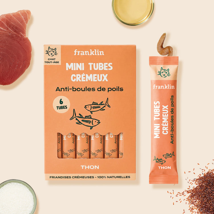 Les mini tubes crémeux anti-boules de poils facilitent l’élimination des poils ingérés ! Le psyllium, une fibre douce, soutient le transit et aide à limiter la formation de boules de poils. Le thon apporte des vitamines D et A, utiles pour la vitalité. La recette riche en eau favorise l’hydratation et soutient les reins. Le tapioca, l’huile d’algues et la levure de bière viennent renforcer la digestion en douceur.